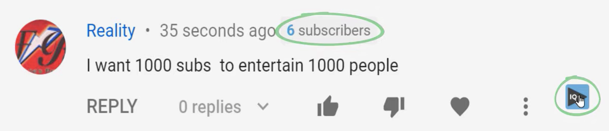 Let's take this as an example. On a video about how to get 1,000 subscribers we see a person who has posted a comment, but they only have six subscribers. We know this because we have vidIQ installed and along with the sub count, you will see this vidIQ button: