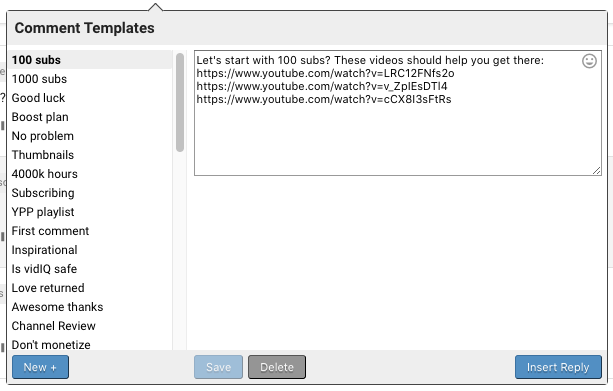 But we also have a lot of ways to say thank you, which courtesy of the vidIQ's tool, also populates the commentor's name to personalize the response.