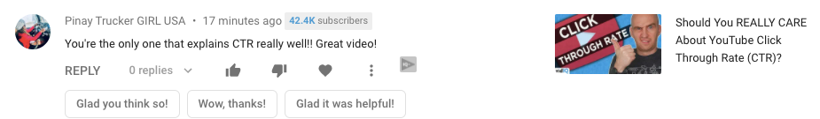 But YouTube's Smart Replies, in combination with vidIQ's comment templates, all which, to remind you, is 100% free, at least gives you a fighting chance of responding to a lot more comments than typing out each one by hand.