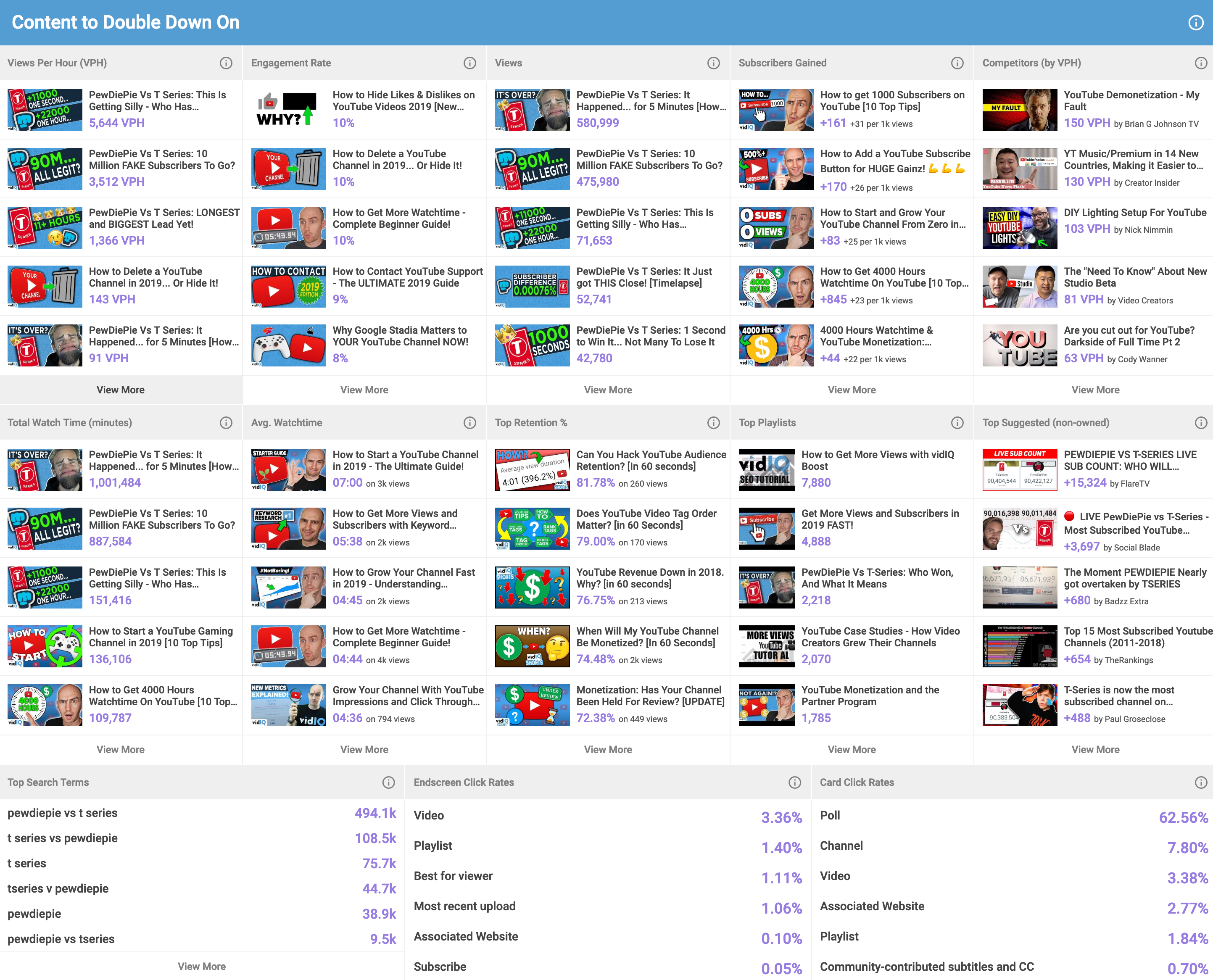 This section shows what's working for your channel based on Views per Hour, engagement rate, YouTube subscribers gained, competitor stats, total and average Watch Time , top audience retention, top YouTube Playlists, and traffic being sent your way by videos uploaded by other channels. Phew.