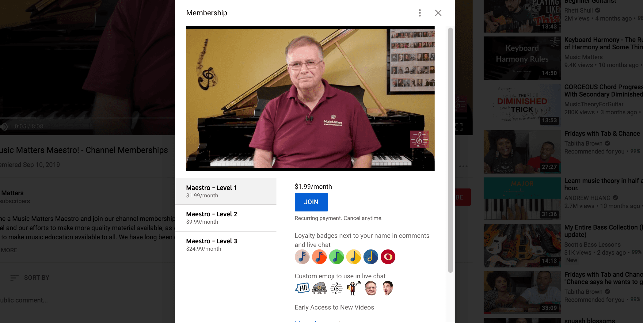 Need a good example to follow? Look no further than Music Matters, a theory channel with 77.3K subscribers and robust membership offerings. The creator of this channel helps viewers become music maestros with three paid plans, as shown below: