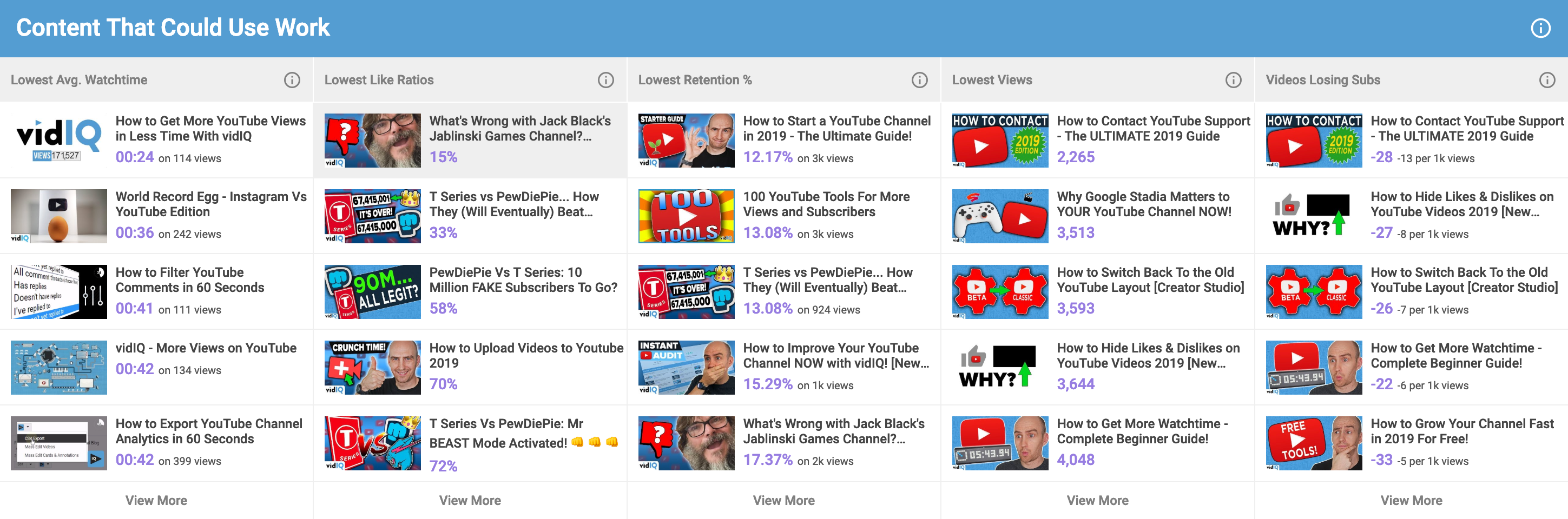 This section shows the videos are doing the worst based on lowest Watch Time, lowest like ratios, lowest retention, lowest views and the videos losing the most subscribers. You can use this information to determine if you should still keep making this type of content.