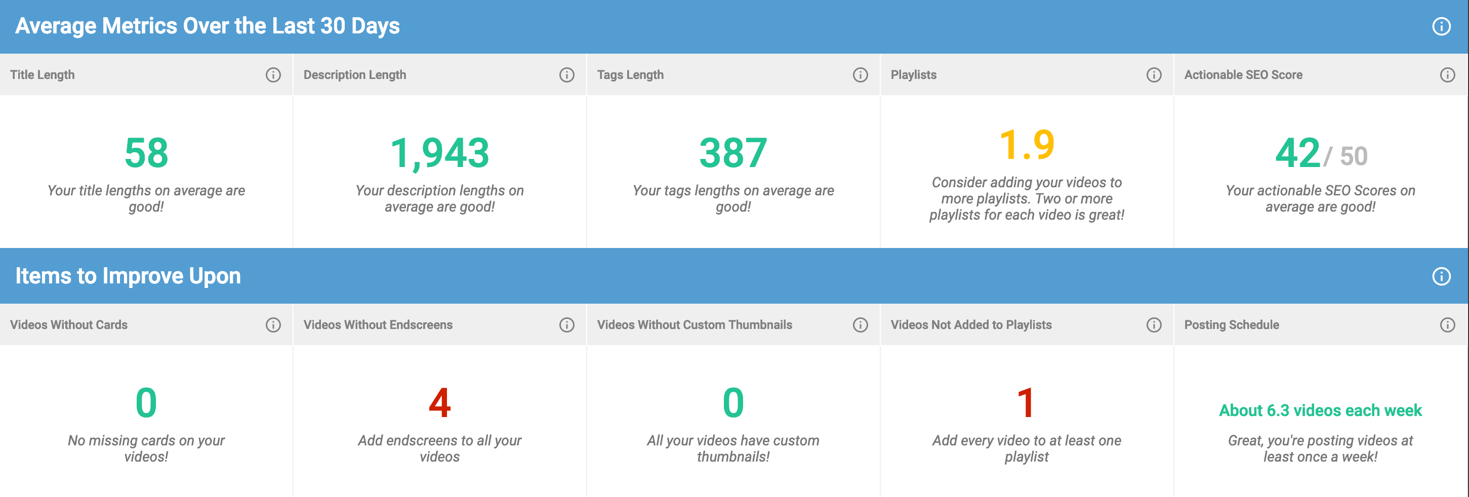 This section of the Channel Audit tool highlights if your video titles, descriptions or tags are too short or long. It will also point out whether you're missing any cards, endscreens, thumbnails or Playlists. How useful is that? Just click on any red numbers to see the videos that need to be corrected and click the edit button to fix them. A once impossible, needle-in-a-haystack job now takes 15 seconds to resolve!
