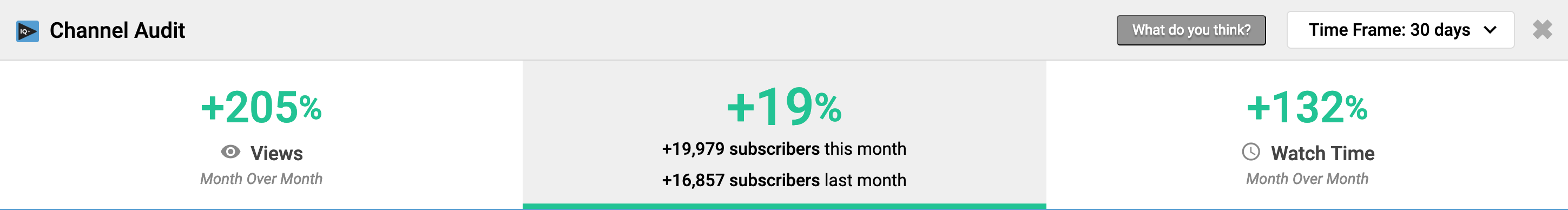 This section shows what's working for your channel based on Views per Hour, engagement rate, YouTube subscribers gained, competitor stats, total and average Watch Time , top audience retention, top YouTube Playlists, and traffic being sent your way by videos uploaded by other channels. Phew.