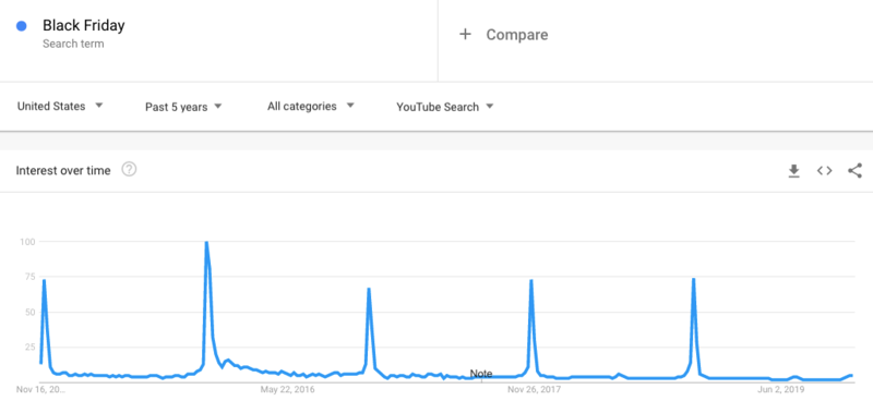Since 2014, according to Google Trends for YouTube, interest from YouTube viewers in the US in Black Friday starts to peak around mid November, and lasts around a month.
