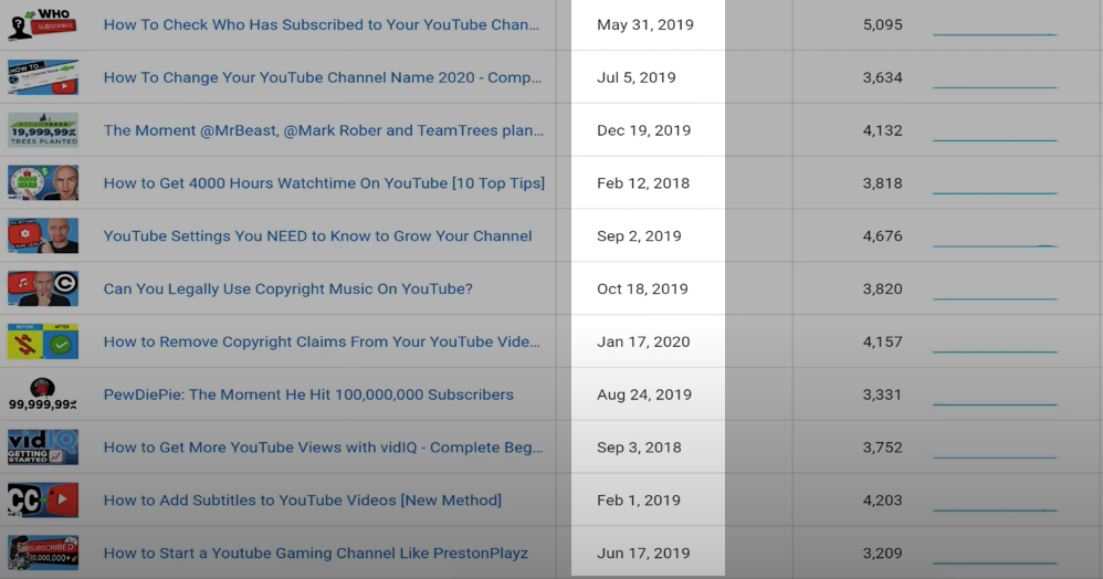 Take a look at these stats. They are real-time view counts for some of our best performing videos on the vidIQ YouTube channel. Notice anything in particular? Take a look at the publish date: