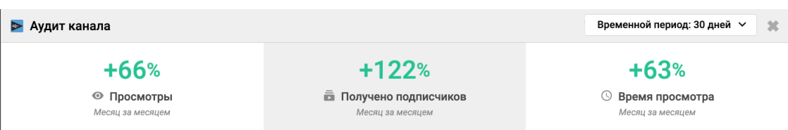 Клик по кнопке "Аудит канала" с левой стороны страницы YouTube откроет всплывающее окно с 5 новыми функциями. Первая функция отображает статистику вашего канала по умолчанию за последние 30 дней. При наведении курсора на каждую из секций вы сможете увидеть детальную информацию.