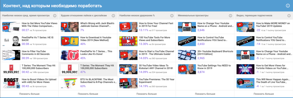 В этой секции вы обнаружите для себя список видео которые не приносят пользу вашему каналу. Информация основана на наиболее низком времени просмотра, плохом рейтинге взаимодействия и удержания аудитории, количестве потерянных подписчиков. Исходя из полученных данных вы сможете принять решение о целесообразности публикации такого рода контента.