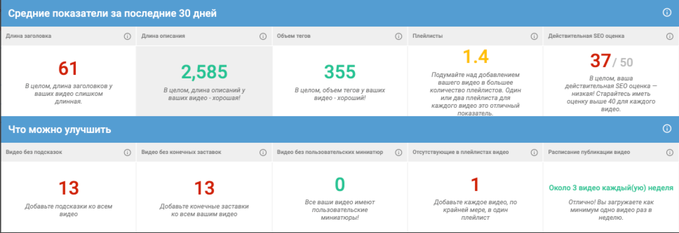 В данной секции аудита канала вы сможете узнать если заголовки, описания или теги ваших видео слишком короткие или чрезмерно длинные. Если интерактивные подсказки, конечные заставки, значки видео или плейлисты отсутствуют у какого-либо видео, вам будет выдано соответствующее предупреждение. Клик по красным цифрам откроет список из видео у которых отсутствует какой-либо элемент. Ранее многочасовая и кропотливая работа теперь займет у вас не более 15 секунд!