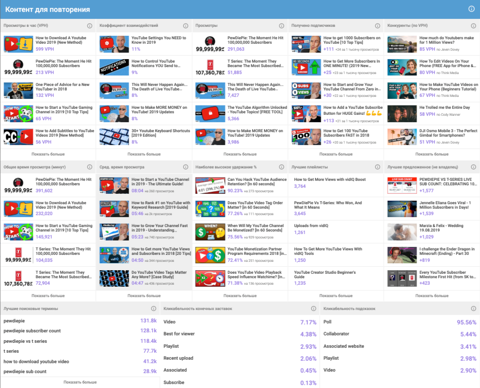 В этой секции вы найдете список контента, который работает на вашем канале и вносит неоценимый вклад в его развитие. Информация основана на количестве просмотров в час, рейтинге взаимодействия, кол-ве привлеченных подписчиков, анализе конкуренции, общем и среднем времени просмотра, удержании аудитории, топ плейлистов и объеме трафика полученного от конкурентов.