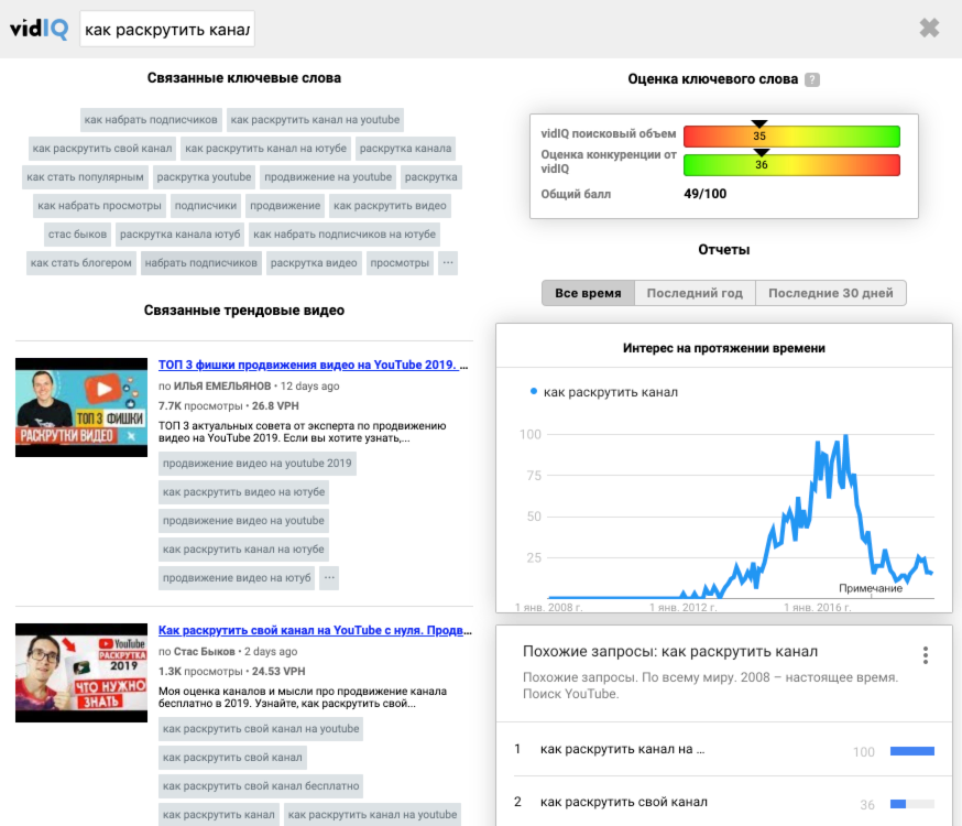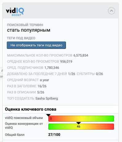 Во время поиска на YouTube, vidIQ отображает вам огромное количество информации по каждому поисковому запросу. Если у вас небольшой канал и вы видите, что такие параметры, как поисковый объем и конкуренция по тегу очень велики, вам следует углубиться на поиске ниши и сконцентрироваться на использовании менее конкурентных ключевых слов. Общая оценка ключевого слова поможет вам быстро понять насколько популярен (или нет) выбранный вами тег. Ключевое слово, которое имеет 100 по шкале поискового объема и 0 по шкале конкуренции - просто бесценно.
