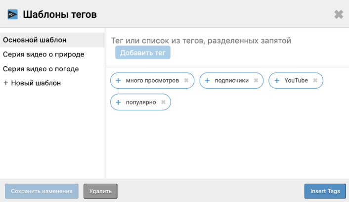 С помощью функции "шаблоны ключевых слов" вы можете создать персональные наборы из тегов, которые вы можете применить, например к определенной серии видео, тем самым существенно сэкономив время.