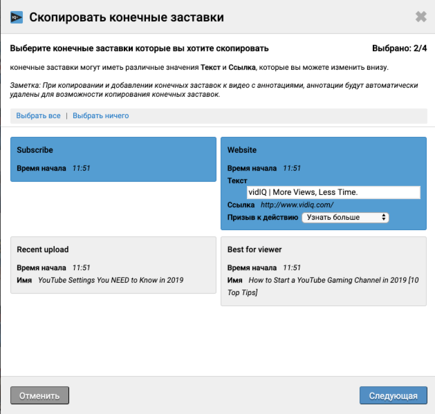 С помощью инструментов vidIQ для повышения производительности вы легко и просто сможете массово скопировать и отредактировать конечные заставки и подсказки. Это сэкономит вам часы работы!