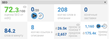 Так как SEO оптимизация один из ключевых факторов успеха видео на YouTube, очень важно знать то, насколько хорошо ваш контент показывает себя на YouTube. Например, вы можете узнать как теги вашего видео конкурируют с популярными ключевыми словами. Наведя курсор на параметр "Оценка SEO" вы узнаете и поймете как мы рассчитываем данный показатель, и на что следует обратить внимание.