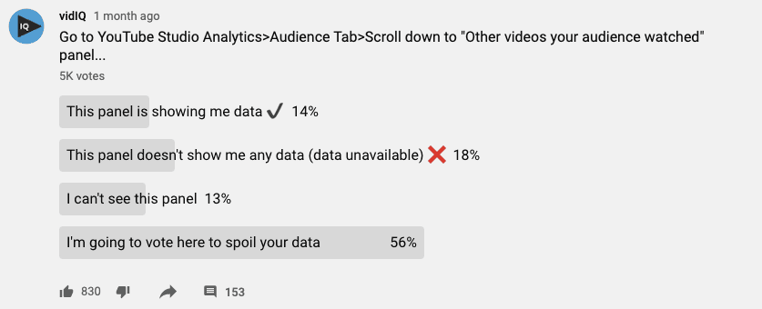 This poll tells us less than half of our typical vidIQ audience is able to see this panel (with data). Our typical audience includes channels under 1,000 subscribers, less than 4,000 hours of Watch Time, and any channel working toward YouTube monetization.