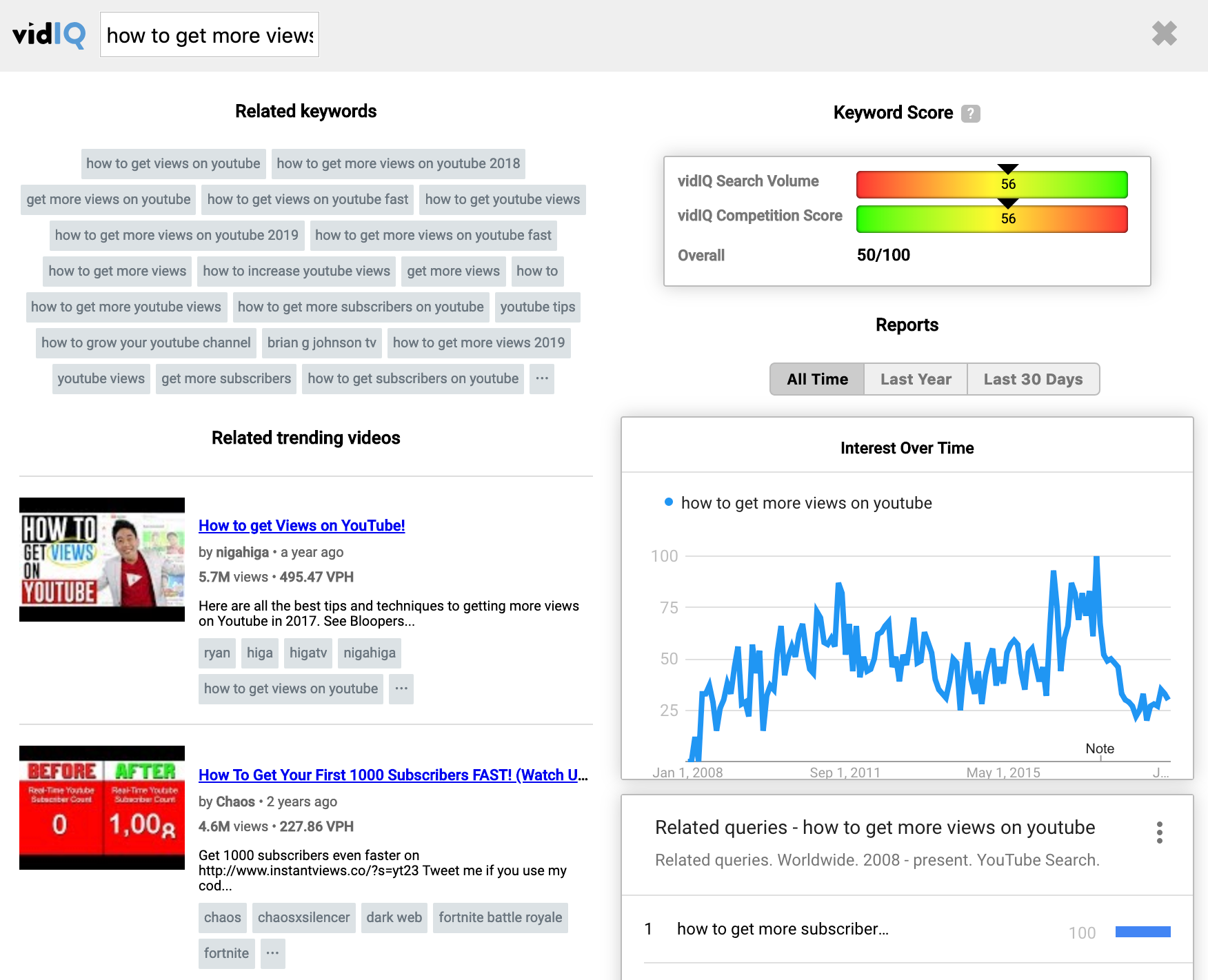 Her gün milyarlarca arama yapılmaktadır ve eğer bunların ne olduğunu biliyorsanız, videolarınızın daha fazla görüntülenme almaları için bu verileri kullanabilirsiniz. Tahmin edin bakalım elinde sömürülecek araçlar ve istihbaratı var? Bizim! vidIQ Boost sizlere önemli araştırma kelimelerini öneren güçlü bir araçtır. Ayrıca trend olan benzer videoları da gösterir.