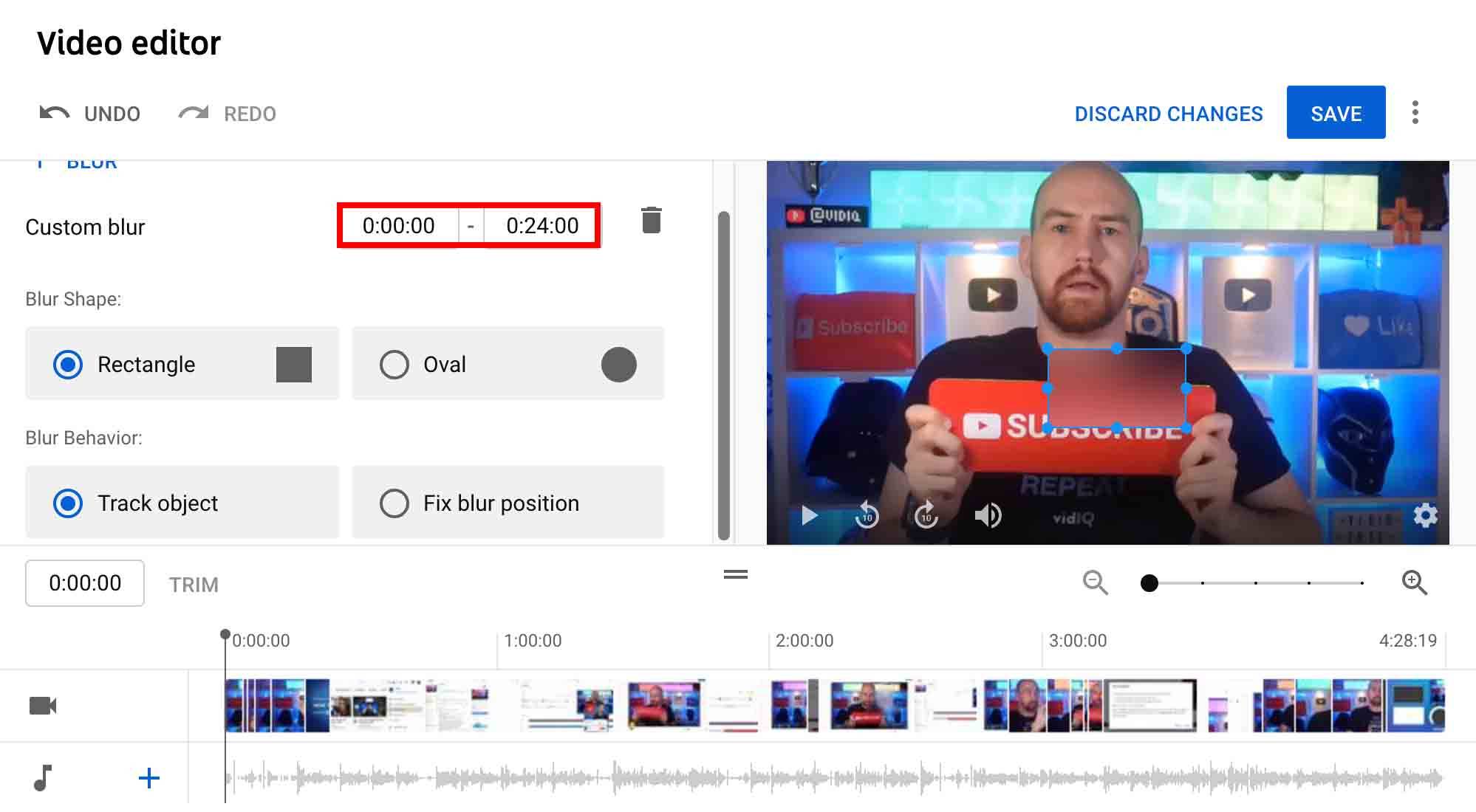 Once you make your selection, you can also reposition or resize your blur shape. To make Rob’s subscribe button disappear, we dragged a corner of the blur box, which is shown in the screenshot above, until it was big enough to hide everything underneath it.