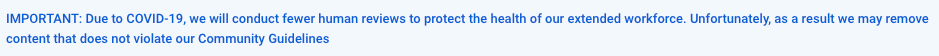 Now there are very few human reviewers looking at this content, and YouTube is relying on AI and machine learning. As a result, what you can expect to see, as creators, is an increase in video removals, even if, ultimately, they don't violate community guidelines.